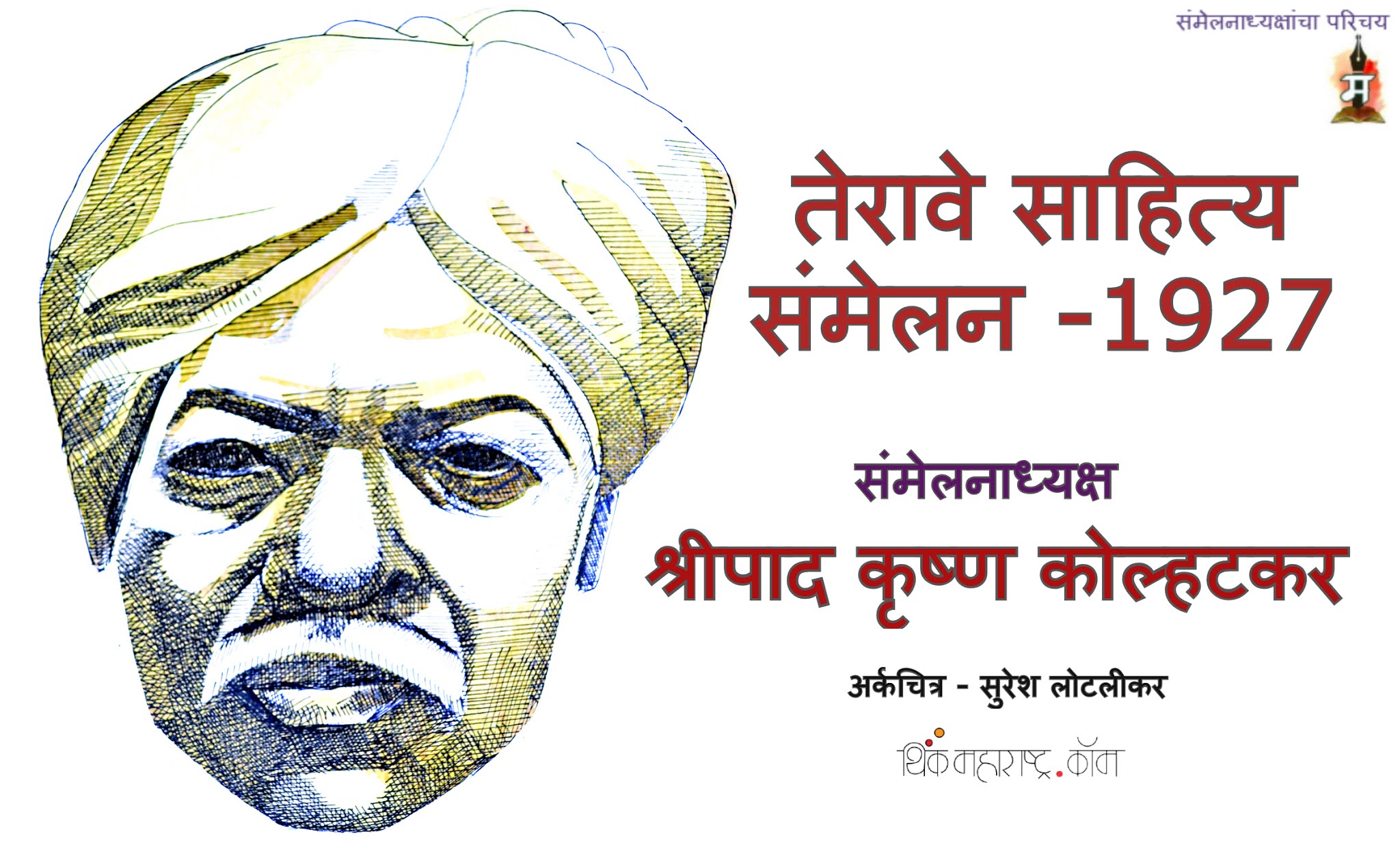 तेराव्या साहित्य संमेलनाचे अध्यक्ष होते प्रसिद्ध नाटककार आणि विनोदी लेखक श्रीपाद कृष्ण कोल्हटकर. ते मराठीतील विनोदी वाङ्मयाचे आद्यप्रवर्तक होत. ‘सुदाम्याचे पोहे’ हा त्यांचा विनोदी लेखसंग्रह म्हणजे मराठी वाङ्मयाचे भूषण मानले जाते. त्यांचा ज्योतिषशास्त्राचा अभ्यास होता. ते ‘बहु असोत सुंदर, संपन्न की महान’ या महाराष्ट्रगीताचे रचनाकार म्हणून परिचित आहेत. त्यांनी शाळेत शिकत असतानाच लेखनास सुरुवात केली. त्यांनी त्यावेळी ‘सुखमालिका’ हे नाटक लिहिले. अर्थात, त्याचे प्रयोग झाले नाहीत. वा पुढे ते फार नावारूपासही आले नाही, पण कॉलेजमध्ये असताना, वयाच्या तेविसाव्या वर्षी तात्यासाहेबांनी ‘वीरतनय’ हे नाटक लिहिले. ते नाटक किर्लोस्कर नाटक मंडळींनी 1896 च्या मे महिन्यात रंगभूमीवर आणले. मग नाटककार म्हणून श्रीपाद कृष्ण गोखले ऊर्फ तात्यासाहेब कोल्हटकर हे नाटकवेड्या रसिक प्रेक्षकांना माहीत झाले व आवडूही लागले. त्यांचे ‘मूकनायक’ हे नाटक विशेष गाजले, पण त्यांना त्यांच्या नाटकांचे मृत्यू त्यांच्या हयातीतच पाहण्यास लागले.